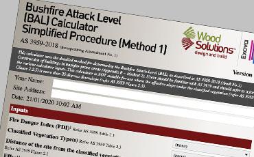 Now you can simply and quickly calculate the bushfire attack level (BAL) for any site. The WoodSolutions calculator allows you to see the effect of changing variables, such as the distance to vegetation, and quickly compare results. Useful for people designing, building and occupying metropolitan fringe and country properties.