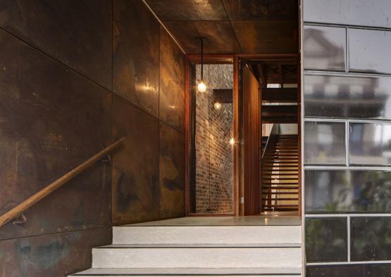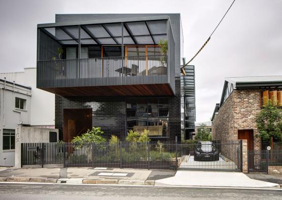 The studio's manifesto is that tiles are like think bricks, and bricks are like thick tiles. This has played an important part in the choice of black tiles with a rich sheen as the exterior cladding. The glossed metallic aesthetic that results, draws the on the rustic interior palette, but with a modern sophistication. The exterior palette and large cantilevered balcony update the warehouse into a housing typology, and extend a welcoming presentation to the street.