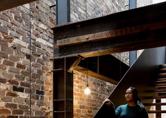 The interior material palette has a strong focus on maintaining the industrial aesthetic. A three-storey recycled brick wall forms the boundary of the stairwell, with exposed beams and joists celebrating the buildings history. Timber is used extensively through the interiors, with a mixture of rustic joists and beams, coupled with newer floorboards and joinery. Many of the materials have been salvaged and recycled from the former life of the warehouse.