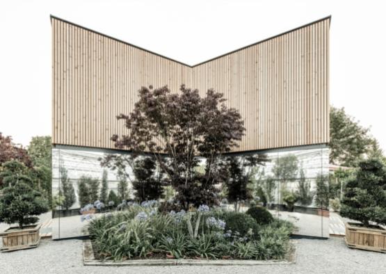 The upper half of the exterior facade is covered with thin stripes of timber cladding, creating the effect of a forest of trees. This effect is heightened by the lower half, which is clad in a mirrored facade. The mirror reflects the surrounding greenery, emphasising the connection that the offices strives to strike between itself and the natural world. This sensual, atmospheric perception makes further explanation unnecessary.