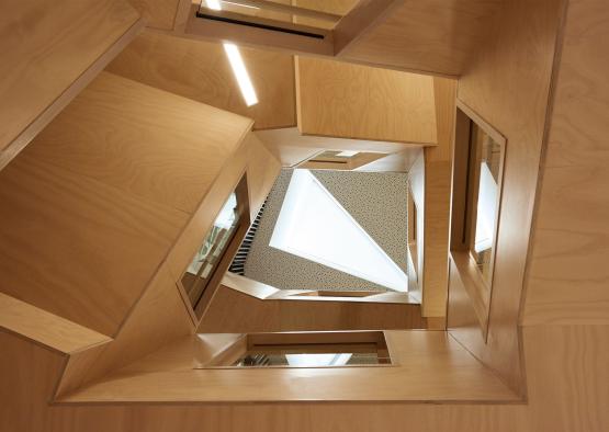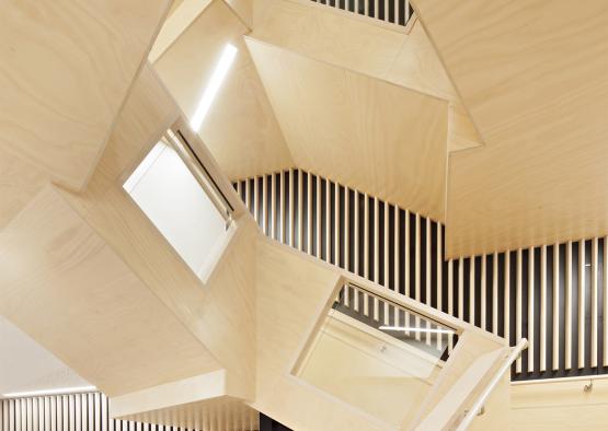 The design intent of the main stair is to create an inviting, sculptural wayfinding element, providing an active hinge point. The movement of timber grain patterns are celebrated, countering the traditional institutional aesthetic commonly found in hospital architecture. The light plywood form punctures an undulating ceiling, providing a beautiful and active focal point that encourages exercise and conversation between staff, patients and their loved ones between the three naturally lit floors. The workmanship and detailing of the plywood cladding wraps the stair runs and balustrading, with inset glazed panels and recessed lighting. Solid timbers accentuate the treads glazing frames and handrail. Contrasting with the lightness of the timber stair is a textured and durable background black japan stained battened timber wall.