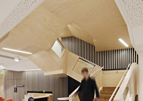 Products: Austral FR paneling; interior hoop pine E0 plywood; face grade A/C from Woodform Architectural; American white oak; solid Victorian ash