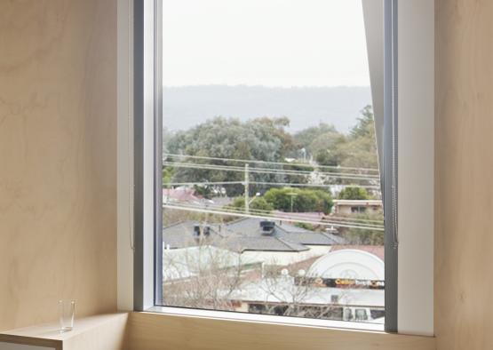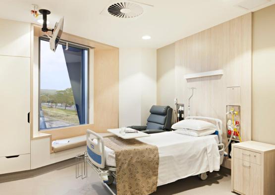 A large timber-lined window frame in in-patient bedrooms invites patients and visitors to appreciate the sun’s daily procession, natural light and aspect, essential to healthful recovery. The façade window-hood orients the patient’s view from the bedhead to the landscape. This connective gesture is accentuated by the window-seat ‘figure’ to the built-in joinery’s ‘ground’. The big warm frame to the outside in turn makes the view feel bigger. The form combined with the warmth of the timber provides a welcome place of calm respite.