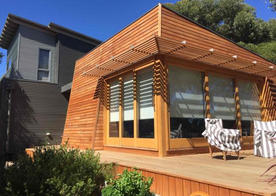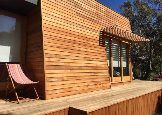 This small studio at the rear of an existing holiday house in Aireys Inlet celebrates the materiality of bushfire resistant Australian timber in the context of the Great Ocean Road.