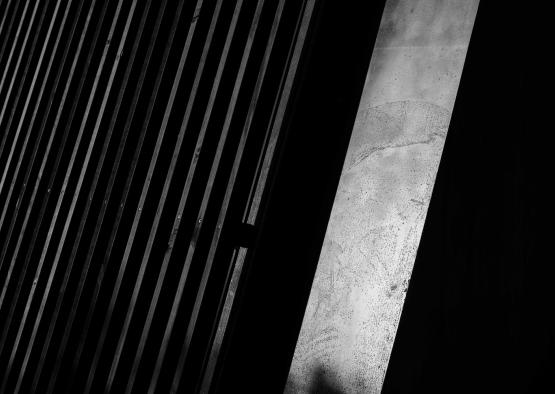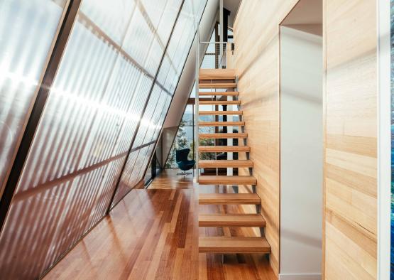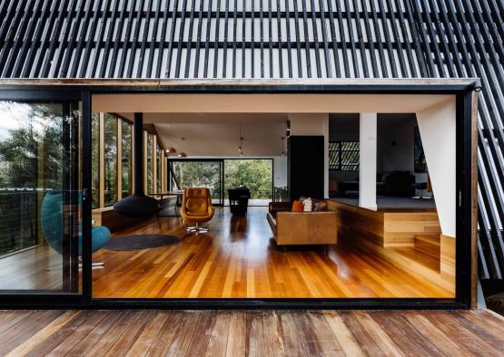 The mostly black outer appearance of the building gives it a modest presence, despite the striking angular form. The dark timber sits gently against the native vegetation of the rural site. From some angles, the rhythm of the timber battens lining the facade appear as a solid wall, but as the house is approached, the perforated wall becomes apparent.