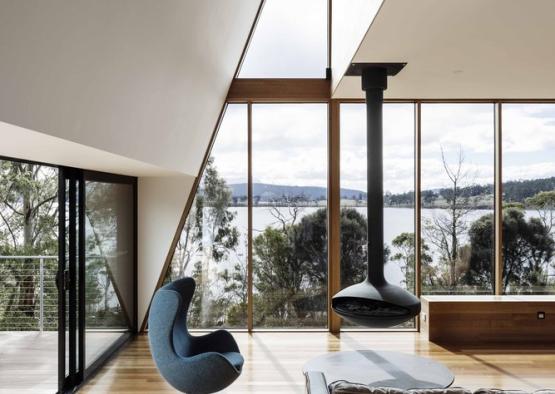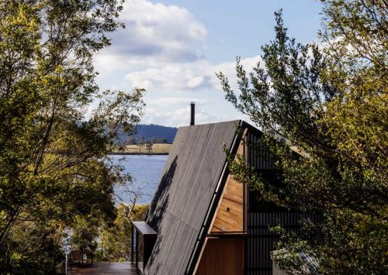 The steeply pitched form takes an A-frame geometry on one half, and a more rectilinear on the other. The front facade overlooking the water is made up of a steel grid with large picture windows.