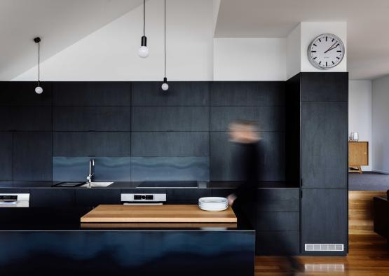 Internally, dark stained timber cabinetry matches the facade, and contrasts with the light coloured timber floorboards. Coupled with the soft timber window frames, the lightly toned wood brings a deep warmth to the interior, soaking up the light and radiating it through the inside.