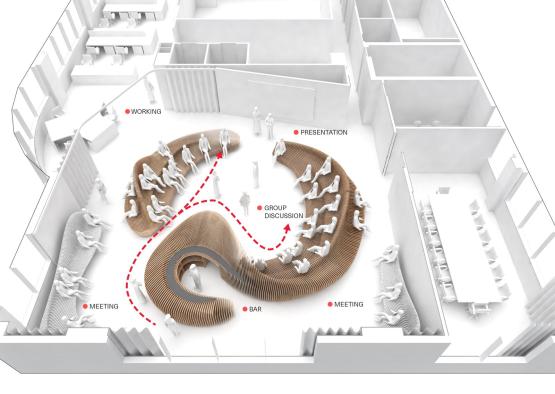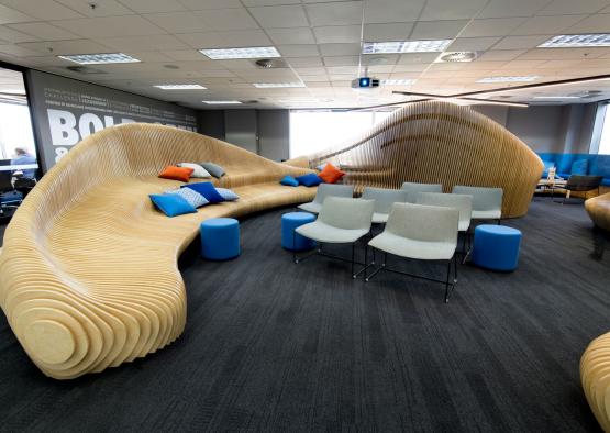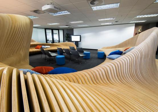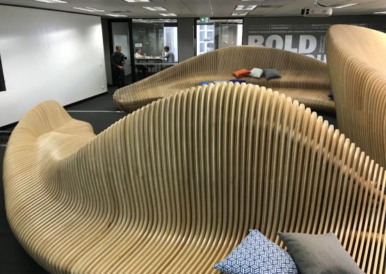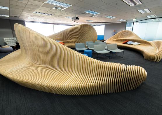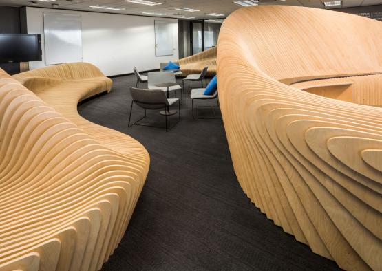 An original brief to facilitate presentations and discussions in a Melbourne office interior developed into a sculptural plywood landscape. Architectural studio Himmelzimmer created an undulating seating and bar area to provide a unique activated zone in an otherwise corporate environment.