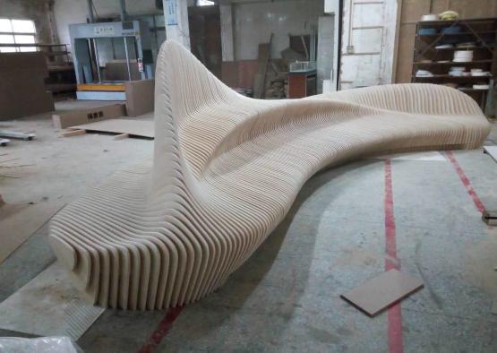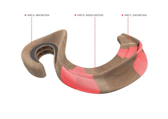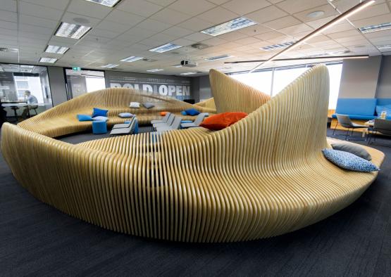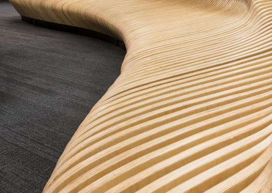 Different fabrication and geometric studies were undertaken during the design process of the Arena. CNC profiled plywood panels became the obvious choice for aesthetically and practically achieving the design. The model was sectioned at parallel intervals to allow a perforated structure that was comfortable and free form. The sectional nature of the seating also allowed cabling to feed through the structure without compromising the integrity. The plywood permitted the undulating shape to be digitally rendered and laser cut in warm timber tones.