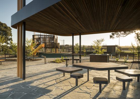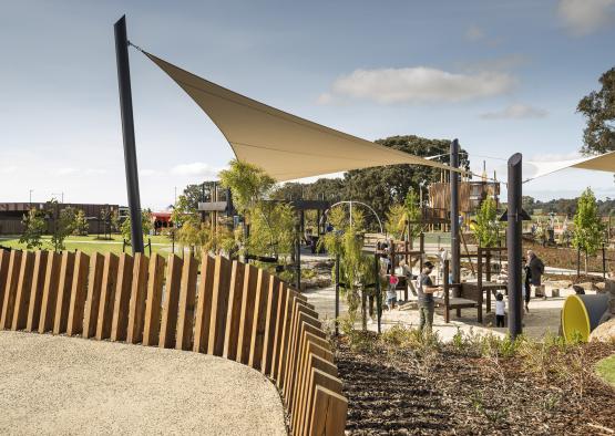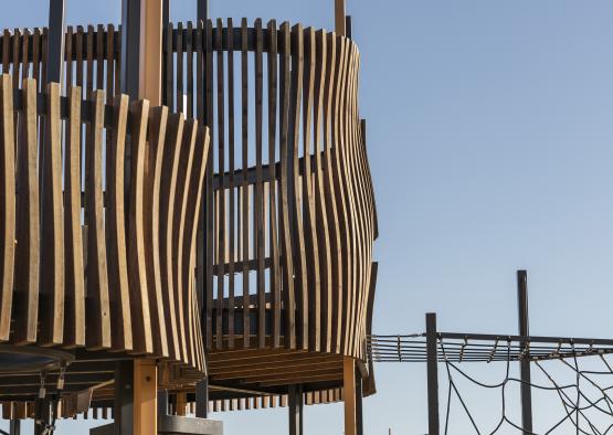 Timber was a core focus of the material palette, both for it’s aesthetic, and for it’s  visual language as a natural, playful material with a strong connection to the earth. MGD sought a strong relationship between the built project and the site, and timber provided an important link between the architecture and the natural environs, forming a mutual bond. Recycled ironbark timber was largely used, along with new white cypress. Seating and play equipment are all timber based, with the park as a whole operating as a celebration of the versatility of the Earth’s most natural building material. Careful detailing minimised timber waste, and innovative uses make timber the star feature of the park. The project’s realisation relied heavily on the unique properties of timber.