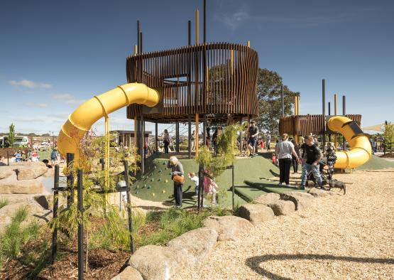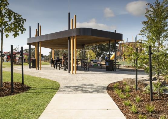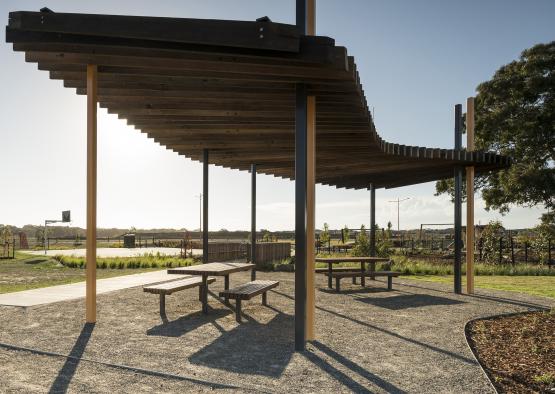 The park project brief included many elements, being the primary green space for an entire new township. It features a large shaded picnic shelter, pergola, BBQ facilities, toilets and amenities, boardwalk, sculptures, a feature play tower, shaded sandy play area, and a diverse range of play equipment. All this has been set within the existing ecosystem of Armstrong Creek, which includes a natural tributary creek line with ancient trees and a more recently built wetland system on the southern end.