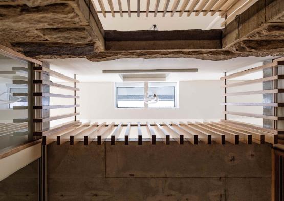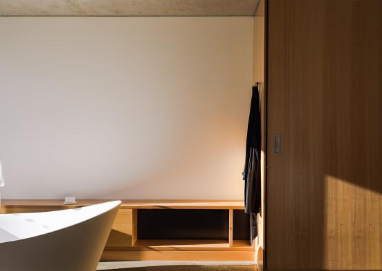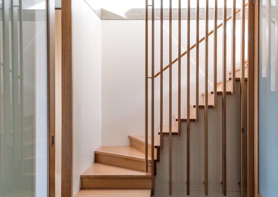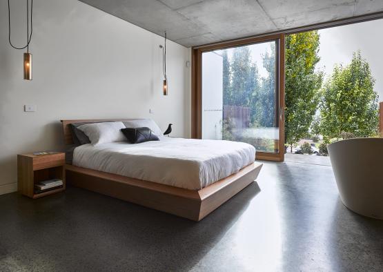 The architectural joinery features solid and veneered Tasmanian oak to ensure an endemic authenticity to the bespoke interiors of Port Officers House on Salamanca Place, Hobart. Tasmanian oak was chosen for its durability, unique visual quality, a sustainable local timber. Timber was chosen as an essential materia to specifically contrast against raw concrete floors and ceilings. Tasmanian oak hues imbue the building with a friendly, inviting, and measured tectonic expression. Stairs, handrails and fenestrations, full height internal and external doors are precision finished in solid Tasmanian oak. The stable solid internal timber doors bifold to allow an underground convict wall turn into a guest room and study. The tactile and warm visual qualities make a luxurious house, a dream home. Like the touch and feel of putting on a favourite coat, the natural Tasmanian timbers are placed on elements within the house that you come close to and touch, like handrails and doors. The detailing is exceptional. Full height Tasmanian oak veneered cupboards turn into a low storage units and shelf – set beside a freestanding bath, big enough for two, perfect for bubbles and a view into the Japanese courtyard. Joinery acts as furniture for displaying sculptures and storing books.