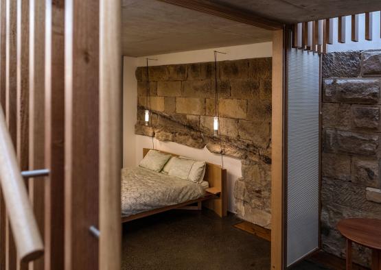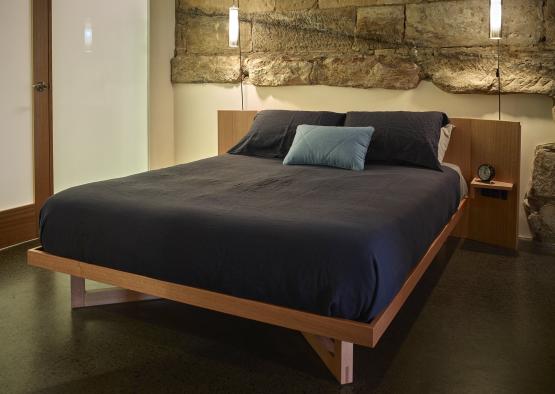 The bespoke bedroom furniture found in Port Officers House is the result of a carefully considered material pallet while elevating a much underrated Tasmanian timber – one often selected for utility over beauty. The inherent beauty and strength found in Tasmanian oak lends itself perfectly to the design and crafting of contemporary furniture, that responds to place and connects with the existing 1840s heritage sandstone wall. The master bed suite emphases the stability and strength of Tasmanian oak expressed through a heavily tapered pedestal base and finely detailed mitred drawers. A balance of rigid geometry with a softening of detail and profile resonates with the qualities of the built environment. The guest room furniture addresses a number of key practical considerations in respect to the site’s existing sandstone wall. The bed head sits gently off the stone wall, giving separation while at the same time providing a sense of enclosure and comfort with the introduction of the gentle folds. It also provides a platform for light switches and a small night shelf for a phone or glasses. All of the bedroom furniture is made from solid timber and veneered panels in Tasmanian oak and finished with mirothane satin clear.