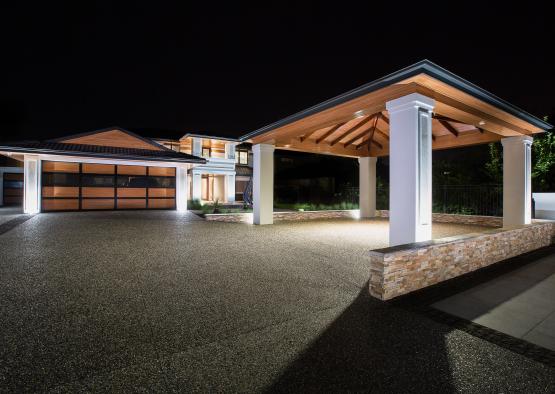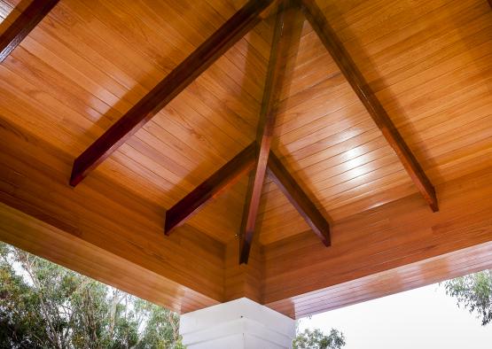 Merbau Glulam was used in the roof structure of the carport for its span capacity and strength under minimal section sizes. The carport needed to span 6m x 6m clear to meet the owner’s boat storage requirements, but retaining a residential aesthetic characterised by smaller structural member sizes with moderate spacings. In order to achieve the spans with 200mm deep rafters at 900mm centres, and 300mm deep hip beams (to keep a residential scale and appearance), Glulam was selected as solid timber would not have met these structural requirements.