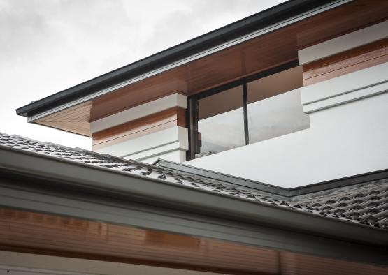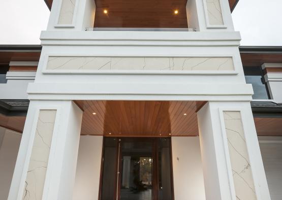 Extensive amounts of timber cladding was used for both the underside of the new carport addition, the 3m deep soffit lining above the ground floor entry and the upper floor soffit lining and portico. The use of timber soffit cladding and horizontal feature panelling were the most essential material choices in the project to achieve the brief requirements of façade transformation and front space activation.