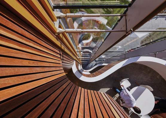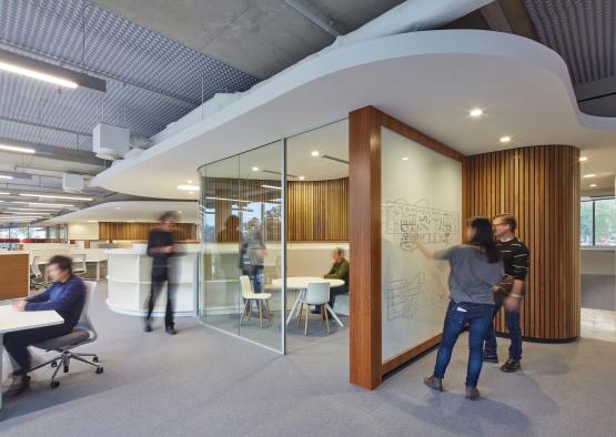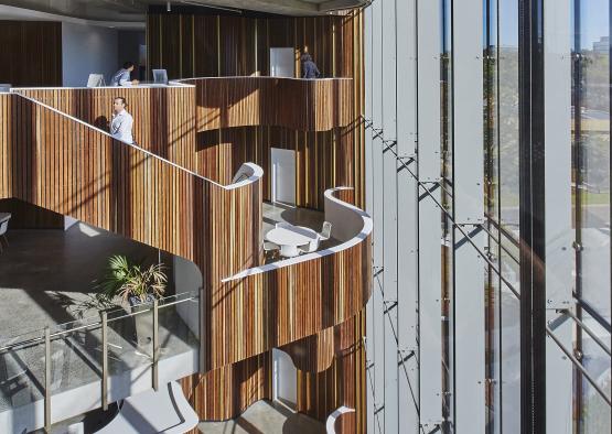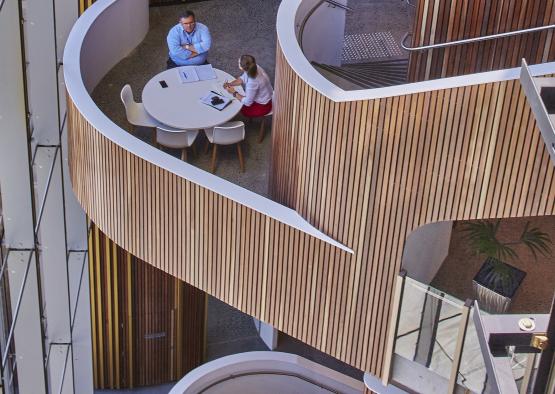 Timber has become the signature material, from its expression in the central atrium that links all levels, and drapes a series of formal and informal meeting spaces, to the way it meanders through the interior of the workplace, highlighting the most collaborative work settings.