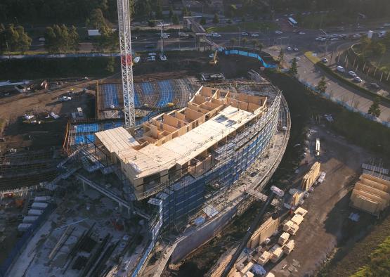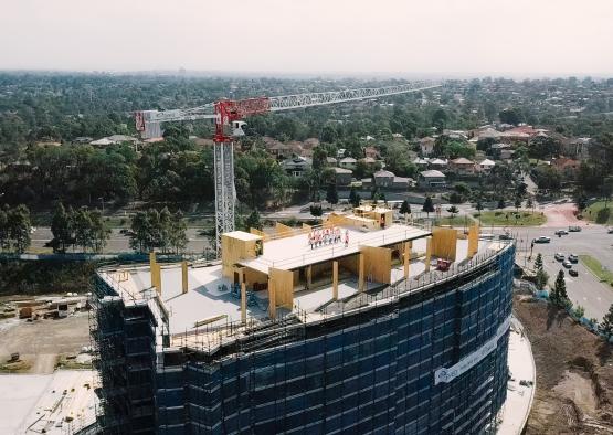 At first principle the sheer volume of mass timber used in this first building of the AVEO Circa Norwest masterplan (app. 2,700m3) has significantly reduced the project's embodied carbon footprint by app. 2,700 tons of carbon compared to an equivalent volume of concrete. The applied timber construction methodology is market leading and the high level of prefabrication reduces energy and water consumption as well as waste production during the construction phase and on site. CLT is approximately 75% lighter than reinforced concrete. This allowed for a much leaner design of concrete footings and transfer structure in ground and throughout the podium levels, thus further reducing the use of reinforced concrete. The reduced weight also reduced transport requirements, truck movements and crane sizes.