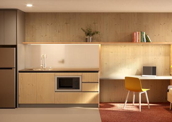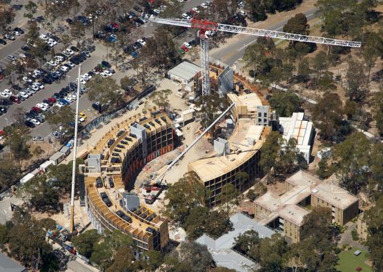The design aims to foster residential life and campus communities by reducing a large-scale development into finer grain and human scale experiences. The building will achieve a 5 star Greenstar as-built rating, and a significantly low carbon footprint: a 76% lower Global Warming Potential (kg of CO2 equivalents) than the corresponding concrete-based design.