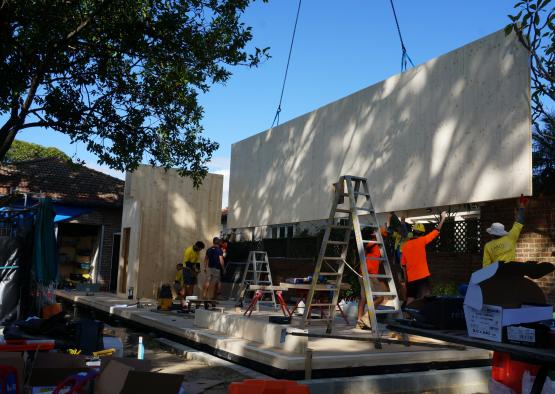 The project site was located at the back of an extremely tight site with little access. On top of this, the clients were still occupying the existing house. A prefabricated structural system was decided upon to create minimal impact on their lives.