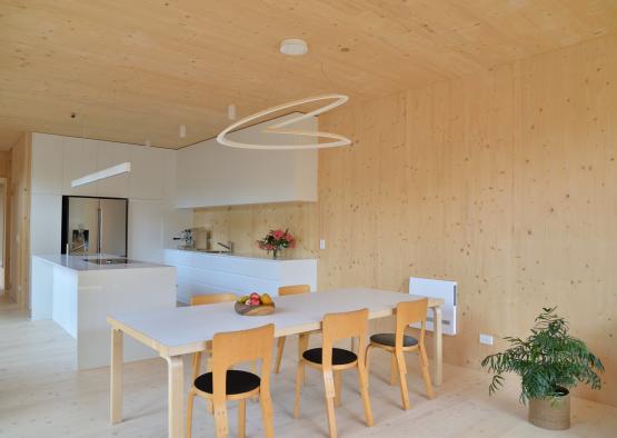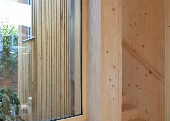 The interior of the building features exposed CLT timber walls, floors and ceilings. In combination with the heat recovery ventilation system, this will ensure a healthy natural indoor environment.