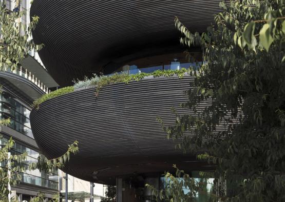 Barangaroo’s exterior cladding is its most unique quality. The unique system uses Accoya timber, which is cured in a vinegar based solution, and then charred using the traditional Japanese Yakisugi technique. The charred layer provides a natural weather resistance and chemical free preservation. In this case, the dowel was sanded back and coated with layer of oil finish. The timber was presented in dowels that were steam bent, then fixed with a custom system to create a double curved cladding. The custom fixing comprises an extruded aluminium bracket that conceals the fixings and creates consistent spacing between the 42mm dowels. The result is a perforated sculptural appearance that has high performance and high aesthetic. The rich, dark appearance is a result of the charred timber.