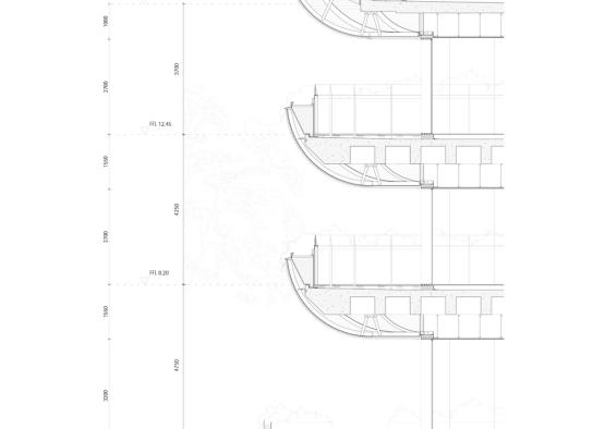 The design choice was made to create a free open floor plan, allowing for future flexibility. The structural cantilevers required a complex and innovative concrete waffle slab design. The slabs included several layers of post-tensioning, interwoven much like a cable-knit jumper, to allow two-dimensional spans, distributing load back to the raking structural columns.