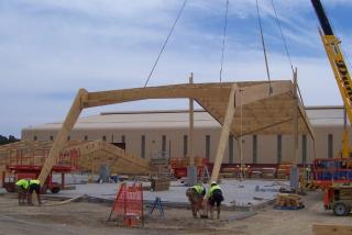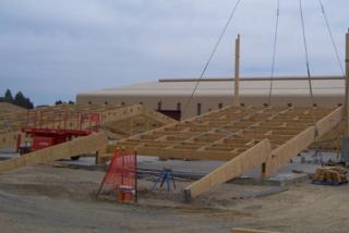 The completed structure has several advantages, including being bird-proof - a very important criterion for some buildings. "With LVL, the purlins are flush with the top of the rafters, allowing roof cladding to be fastened along the length of the structure," said Structural Engineer Peter Dixon. "Further, roof end braces are compression diagonals in the end bay of the roof and second bay of the wall, eliminating crossed tension braces where birds may nest."