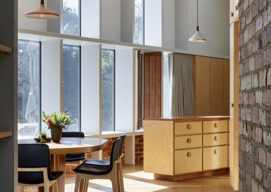 Reused Victorian ash timber from the previous structure was used for flooring, and recycled blackbutt timber was used for doors and windows. The architects add that ‘reusing timber flooring from site does not require justification, it is sustainable, has character and tells the story of using the site’.