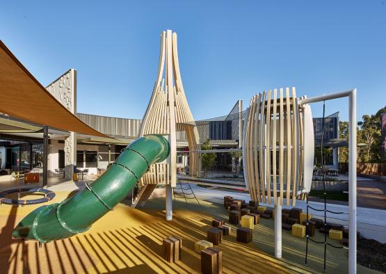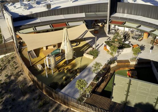 The newly developed Eastern Creek Quarter features an Australian-first 'revolving retail' concept as part of their entertainment precinct 'ECQ Social'. This unique, sustainable and engaging outdoor space features a custom-designed playground with exceptional use of timber such as curved glulam and recycled hardwoods. Reflecting its high-profile Western Sydney Parklands location, ECQ is a global leader in environmental sustainability. Stage 1 has been awarded a 6 Star Green Star Design rating by the Green Building Council of Australia, representing world leadership.