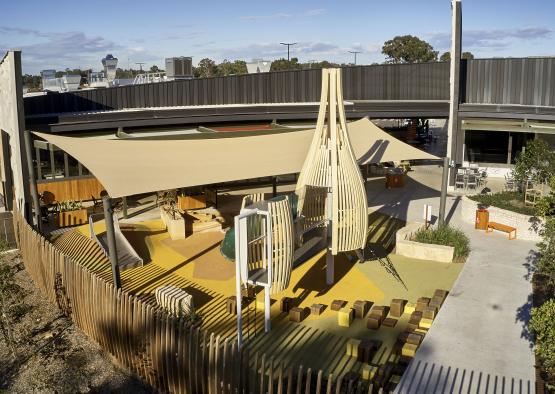 The space offers entertainment, shopping, and alfresco dining areas and an activated outdoor space including an innovative curved timber pod play design which has functionality and neighbourhood at heart.