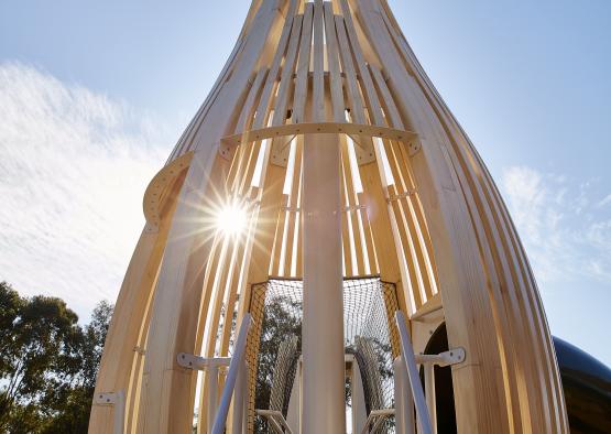 Organic curved timber pods form the architectural structure of the custom-designed playground