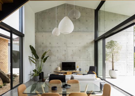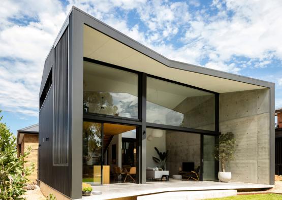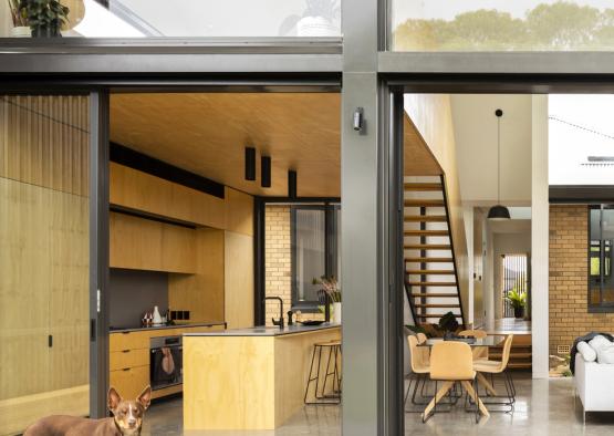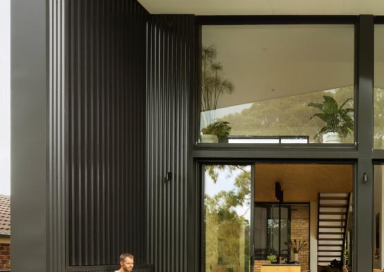 Binary House is an addition to a 1960’s yellow brick house in Woolooware, Sydney, compromising both private and a communal dwellings.