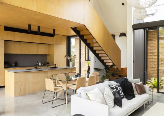 Honey coloured hoop pine plywood forms a major part of the interior lining, and is contrasted with the colder and more modern and sleek grey concrete. The two colours reference the existing colour palette from the main building. The honey coloured ply was carefully considered to match the brick colour from the 60’s building. Blackbutt T&G boards were used as the flooring, and for the stair treads, and were treated with a natural oil finish. Joinery was made from a combination of solid and honey coloured ply timbers.