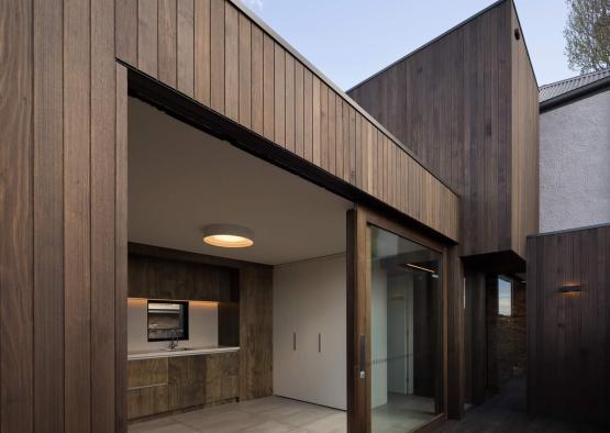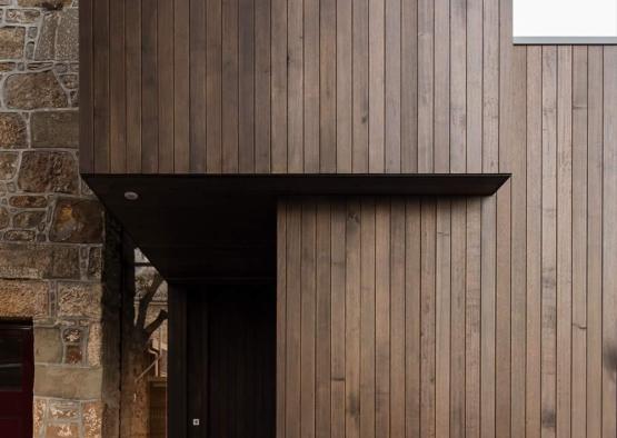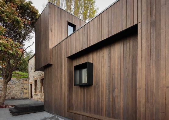 Solid Tasmanian oak tongue and groove shiplap timber was used for the exterior cladding, along with design pine for the decking. The exterior cladding was finished with a dark stain. The cladding extends to the door, which is lined in the same boards.