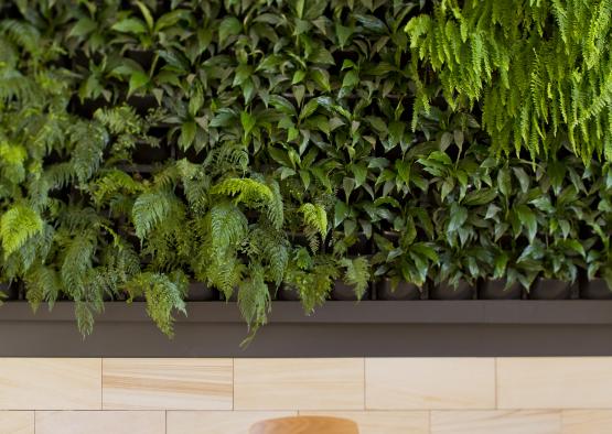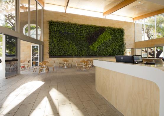 Radiata Pine glulams with Hoop-Pine ceilings were used to create an immediate awareness in the community about sustainable living and buildings. This provides a soft and tactile building, with the structure on display for people to see (they can also see the hot water farm and other features). This is complemented by the large vertical garden in the foyer, which draws people into nature, but also provides air quality and cooling benefits.