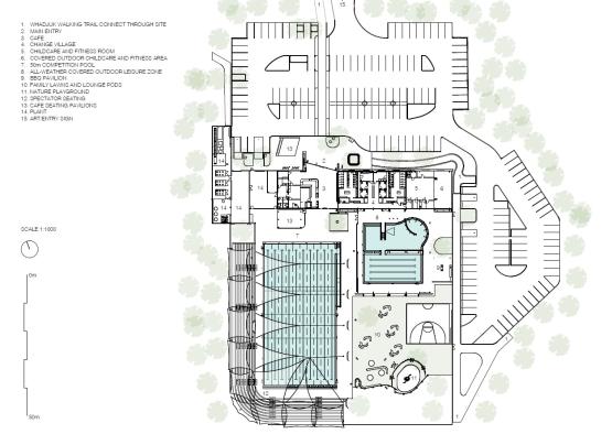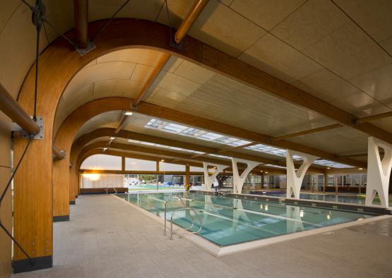 The design needed to incorporate the long spans over the leisure pool (15m spans), while keeping the ceilings quite low to allow enough natural light into the main building behind, and while respecting the tree line.