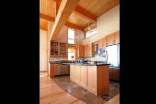 All of the Douglas fir trims and details, cabinets and doors, and maple flooring is clear-finished.