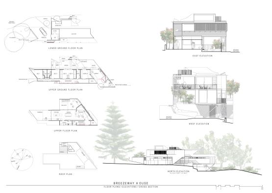 A significant overhang from the second storey forms a carport below, with the floating elements elegantly supported by a twisted steel support.