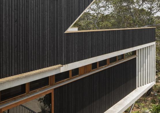 The charred timber box is set between expressed horizontal concrete planes which make up the floor plates. The result from the exterior is a clear expression of levels, with the timber defining the habited, and the concrete defining the structure.