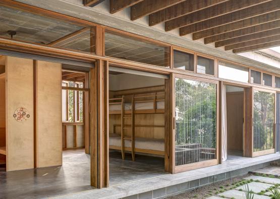 To enhance the ambiguity between inside and outside, ironbark decking with corked joints was used for flooring, and charred external timber cladding was used to line the walls leading to the bedrooms.