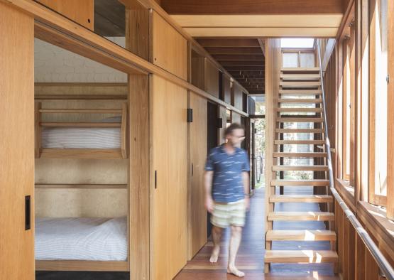 Plywood is used extensively throughout the house for site-built joinery and built in seating and is certified from sustainably managed forests. It has skillfully constructed on site with solid blackbutt edging. Bunkbeds were also made on site with solid Blackbutt.