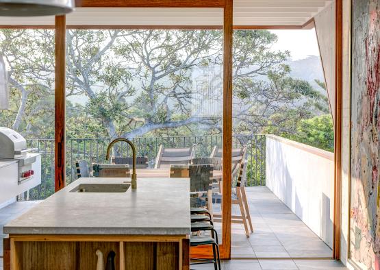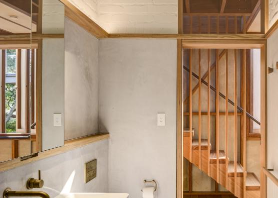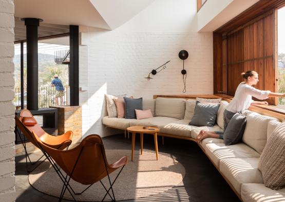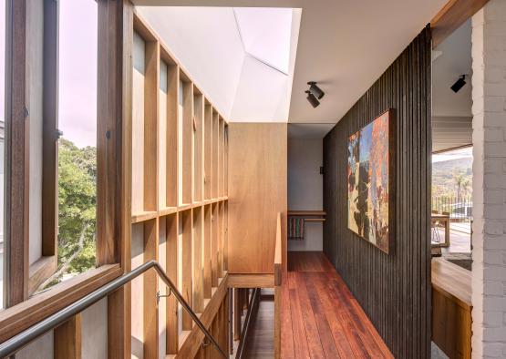 Hoop pine panels were used to line the ceiling, nestled in above the exposed hardwood joists. The hoop pine has also been used for custom fabricated sliding doors to the bedrooms, and was edged with blackbutt.
