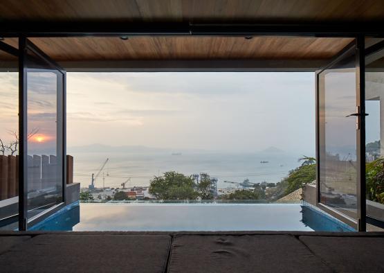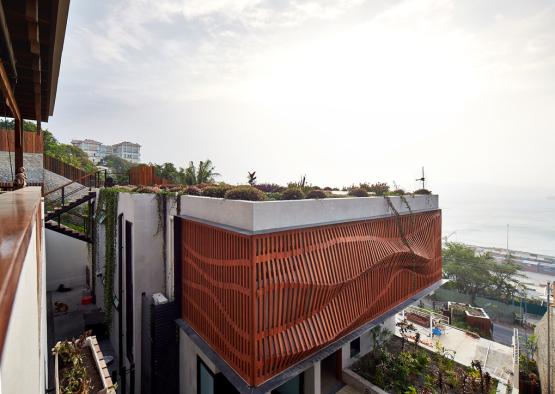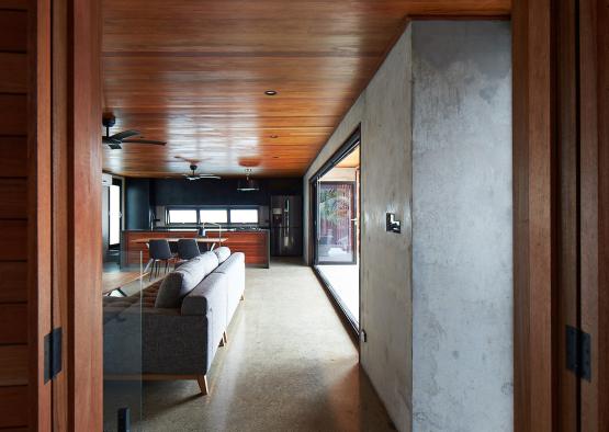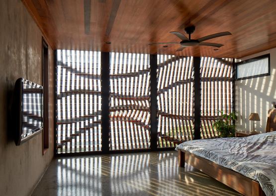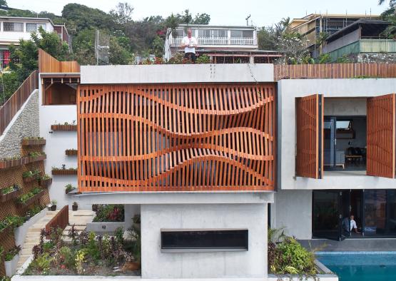 The grand gesture of the tropically set dwelling is the sculptural sun shade which wraps the upper level. Taking an undulating form on the front facade, the skin then flattens out to create an operable shade on the west facade. Intense direct sunlight is common in Papua New Guinea, so the shade provides both form and functional purpose. The full height shade can be manipulated to allow maximum exposure to views of the Coral Sea beyond.