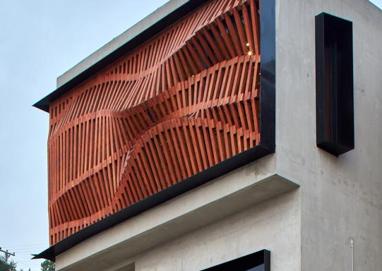 The screen is made from over 2000 individual acetylated Accoya Pine timbers. The form was designed digitally, which allowed the Gold Coast based studio to rigorously test the variables, shape and effectiveness of the screen in a digitally replicated environment. The design was partly an exploration into the ability of modern software to provide a platform for complex geometry, and mass customisation.