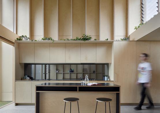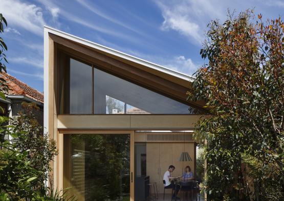 This residential addition showcases timber to create a warm and detailed space, in contrast with the retained brick portion of the original Edwardian terrace house.
