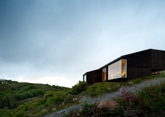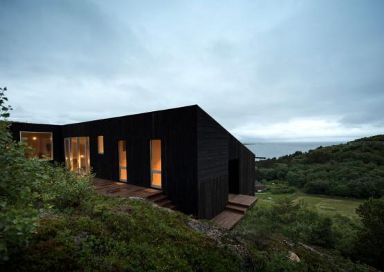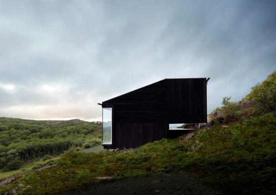 The black stained timber cabin was designed to minimally intervene on the rugged landscape adjacent to a Norwegian lake. The simple cabin is instead at the service of the two contrasting views sweeping around it - the lake to the west, and the seemingly endless green vista to the east.