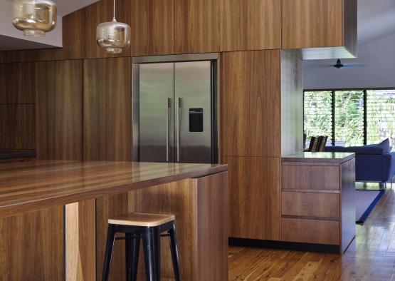 All of the timber veneer is Spotted Gum with a crown cut. Spotted Gum was selected for its durability and subtle nuances which underpins the sub-tropical design aesthetic. The majority of new timber work in the house (screens, decks, flooring etc.) were also Spotted Gum, the materiality of which defined the parti of new elements and insertions within the existing building fabric.