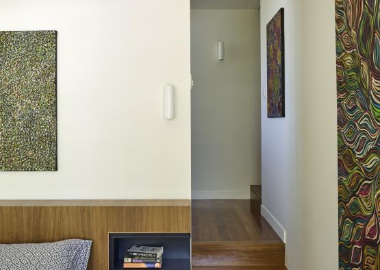 The majority of the glazing on the house is aluminium, however timber windows were incorporated to denote the projecting windows at the entry and master bedroom. The timber windows also integrated with internal seats and nooks which provide areas for the display of artefacts and for respite.