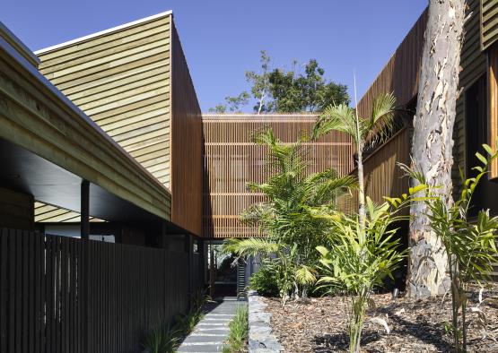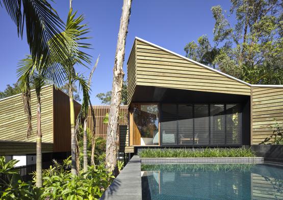 The scheme emerged from three key considerations: defining a clear parti and entry sequence, modulating the old and new timber elements and responding to the existing building. A timber ‘veil’ was introduced to the façade providing privacy and modulating the elements. Replacing fixed glazing and narrow decks with operable walls and ventable clerestories allowed the home to become more climatically responsive.