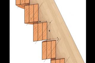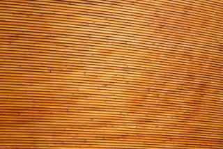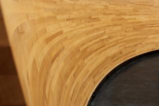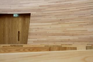The main volume of the complex is marked by the chapel itself. This unique bowl shaped form, rising 11m above the square is covered almost entirely in horizontal finger-jointed spruce pieces. These staggered bent members, of varying lengths (usually 1-5 metres) are fastened with screws and fixed three pieces (per horizontal strip) deep. 45mm in height, the 3 layers measure around 35mm in depth, with a 5mm shadow gap between each level of spruce. Each horizontal cladding piece was bent to unique radiuses to fit the cures of the building.